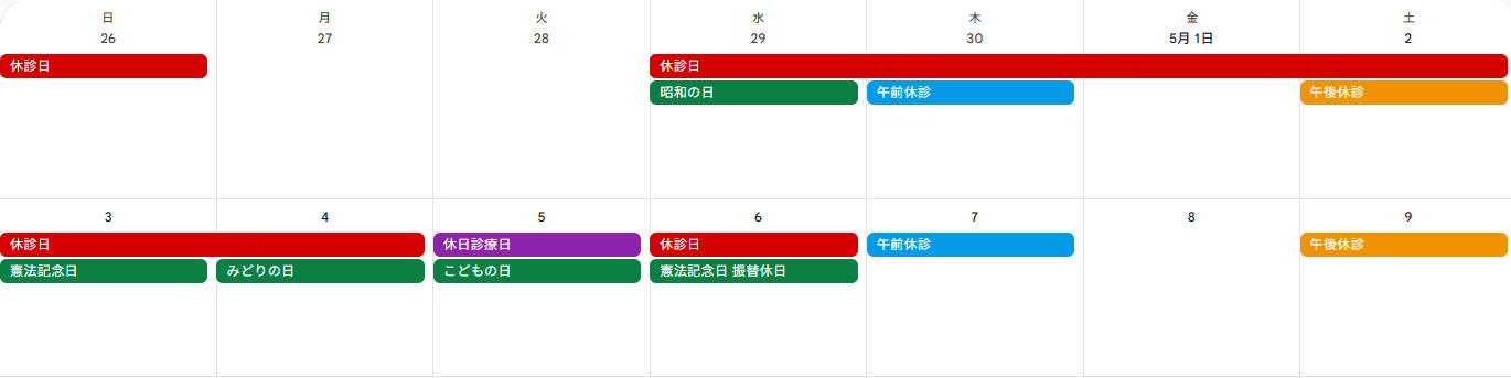 2026年のゴールデンウィークの診療予定は以下の通りです。